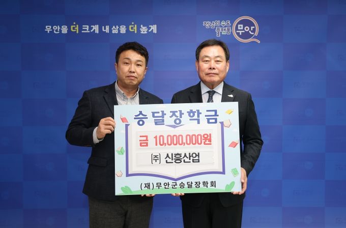 (포탈뉴스통신) 전남 무안군은 지난 1일 지역인재 육성을 위해 ㈜신흥산업이 장학금 1천만 원을, 청솔수산 윤낙진 대표가 장학금 1백만 원을 각각 (재)무안군승달장학회에 기탁했다고 밝혔다.
