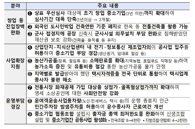 규제신문고, 경제협·단체, 지자체 등을 통해 현장의 의견을 폭넓게 수렴하고, 관계부처 협의를 거쳐 중소기업·소상공인의 ▴창업 등 진입장벽 완화 ▴사업확장 지원 ▴운영부담 경감을 위한 총 17건의 과제를 발굴했다.