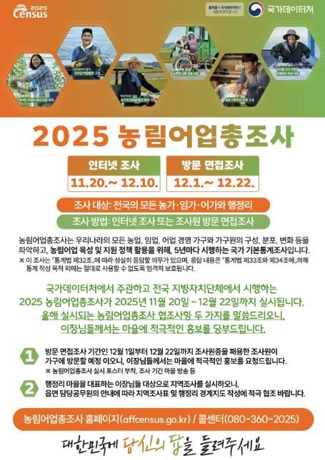 (포탈뉴스통신) 예천군은 12월 1일부터 22일까지 인터넷 참여가 어려운 가구를 대상으로 ‘2025 농림어업총조사’를 방문하여 실시한다.
