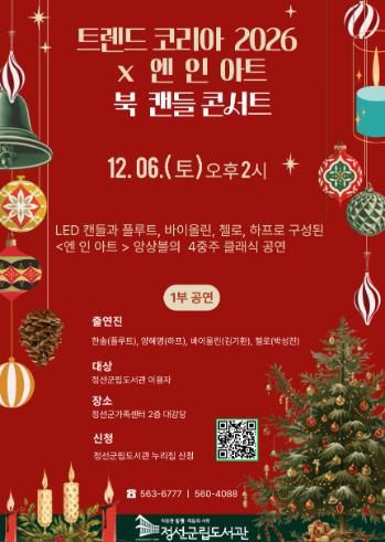 (포탈뉴스통신) 정선군립도서관은 오는 12월 6일 오후 2시, 정선군 가족센터 2층 대강당에서 ‘트렌드 코리아 2026 × 엔 인 아트 북 캔들 콘서트’를 개최한다고 2일 밝혔다.