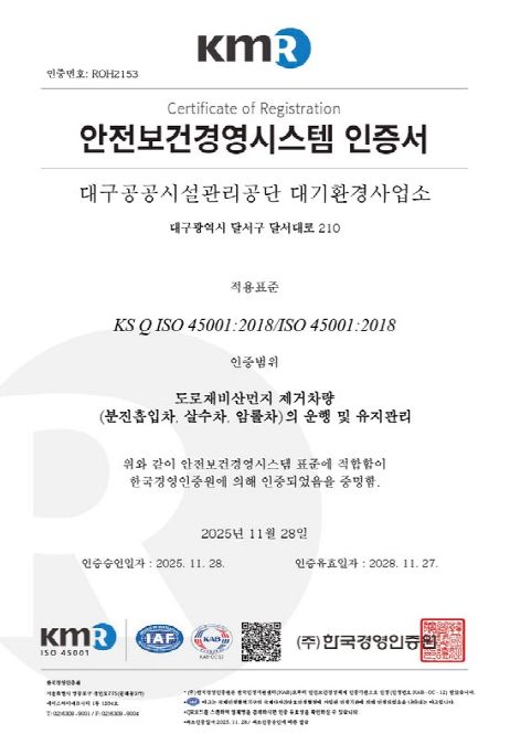 문기봉 대구공공시설관리공단 이사장은 “이번 인증은 공단이 모든 근로자와 시민의 안전을 지키기 위해 노력한 결과”라며, “앞으로도 국제 표준 안전 기준을 유지하고, 직원 모두가 안전 점검과 관리 활동을 지속해 안전 문화를 확립하겠다”고 말했다.