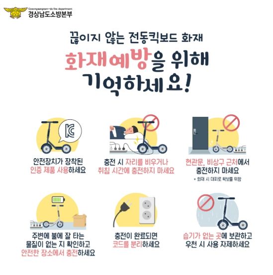 전동킥보드를 안전하게 사용하기 위해서는 ▲ 안전장치가 장착된 인증제품(KC) 사용 ▲ 안전한 장소에서 충전 ▲ 현관문·비상구 등 대피로에서 충전 금지 ▲ 습기가 없는 곳에서 보관 등 기본 안전수칙을 반드시 지켜야 한다.