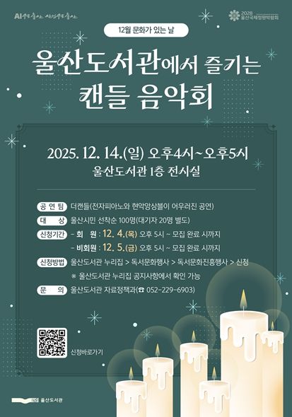 (포탈뉴스통신) 울산도서관은 12월 문화가 있는 날을 맞아 오는 12월 14일 ‘겨울 도서관 양초(캔들) 음악회’를 개최한다고 밝혔다.