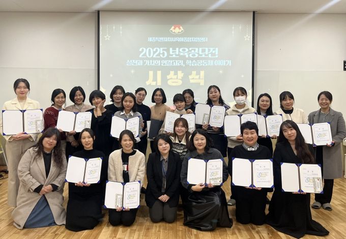 (포탈뉴스통신) 세종특별자치시육아종합지원센터(센터장 임이랑)는 관내 보육교직원을 대상으로 진행한 2025 보육공모전 ‘실천과 가치의 연결고리, 학습공동체 이야기 ’의 수상작을 선정하고, 12월 4일 시상식을 개최했다고 밝혔다.