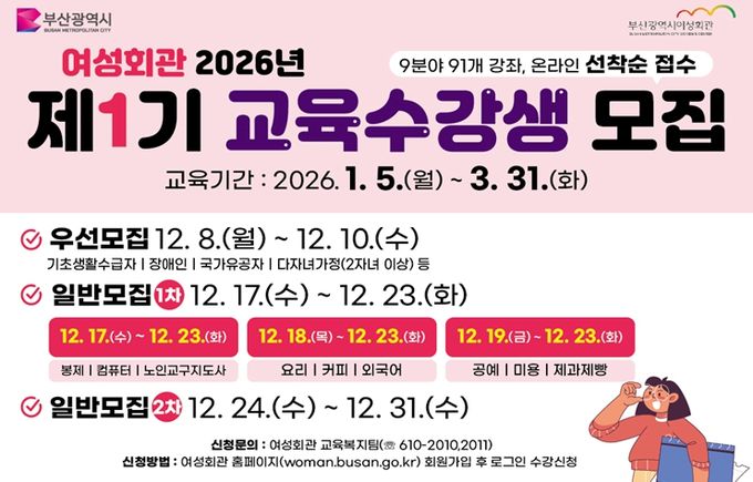 (포탈뉴스통신) 부산시 여성회관은 내일(8일)부터 '2026년 제1기 교육과정' 수강생을 모집한다고 밝혔다.