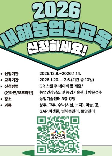 군은 농업 경쟁력 향상과 기후 변화 대응 역량 강화를 위해 총 1,000명 규모, 10개 과정의 집합교육을 편성해 내년 1월 20일부터 2월 6일까지(기간 내 10회) 운영할 계획이다.