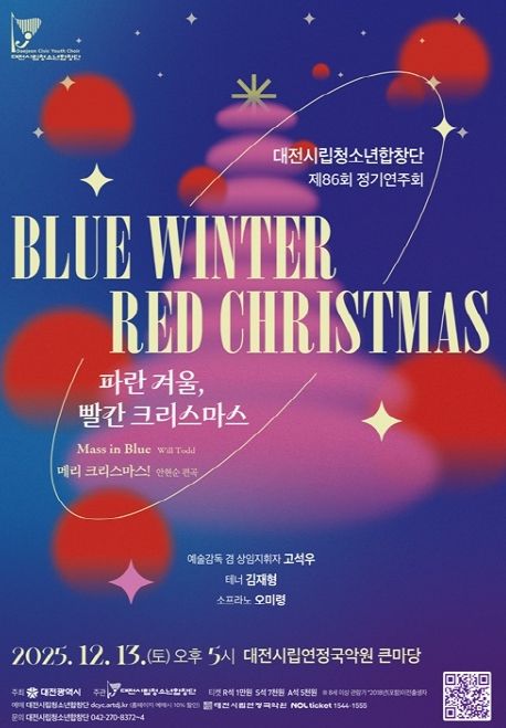 (포탈뉴스통신) 대전시립청소년합창단이 13일 오후 5시, 대전시립연정국악원 큰마당에서 제86회 정기연주회‘파란 겨울 빨간 크리스마스’(Blue Winter Red Christmas)를 무대에 올린다.