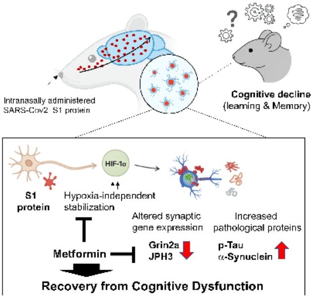 연구 결과, 코로나19 바이러스의 스파이크 단백질(S1)이 뇌에 도달해 신경세포 간 연결(시냅스) 기능을 방해하고 기억형성에 중요한 NMDA 수용체 유전자 발현을 감소시키며, 치매와 파킨슨병 관련 독성 단백질(타우 및 알파 시누클레인) 축적을 증가시키는 것으로 확인됐다.
