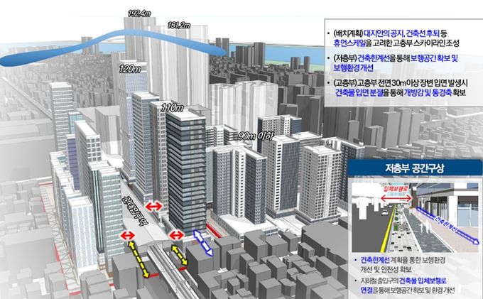 이와 함께 아차산로변의 복합용도 도입을 위해 최고높이를 20m 완화(100m→120m) 했고, 최대개발규모, 필지분할선, 획지계획을 전면 폐지하여 보다 자율적으로 개발을 추진할 수 있는 기반을 마련했다.