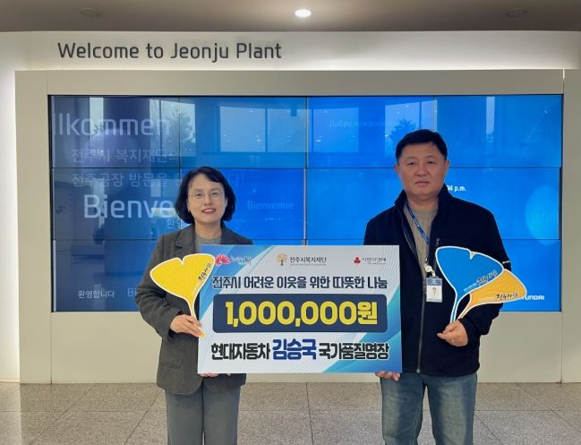(포탈뉴스통신) 현대자동차 전주공장 김승국 국가품질명장은 16일 전주시복지재단에 어려운 이웃을 위한 성금 100만 원을 기탁했다.