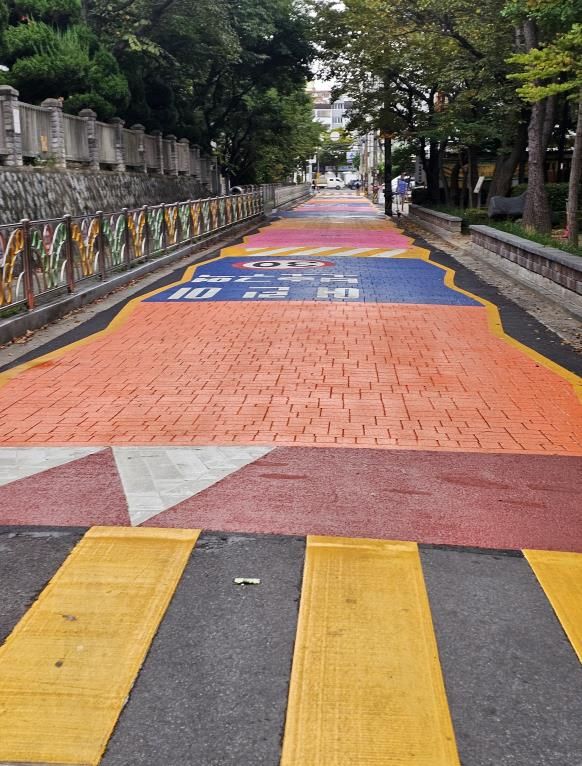 특히, 삼일초 인근 도로 618m 구간에는 분홍색과 노란색, 파란색 등 다양한 색상을 활용한 도막 포장을 적용해 운전자의 주의를 환기했다.