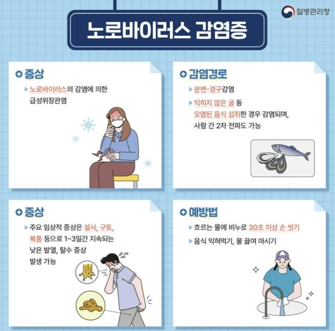 아울러 노로바이러스 감염증 환자는 증상이 호전된 이후에도 48시간 동안 등원·등교 및 출근을 자제해야 하며, 환자가 사용한 공간이나 화장실, 분변 또는 구토물에 오염된 물품은 락스 희석액을 사용해 철저히 소독해야 한다.