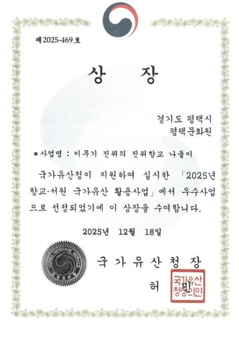 (포탈뉴스통신) 평택문화원은 12월 18일 대전 전통나래관 다목적강당에서 열린 국가유산청 주최 ‘2025 우리고장 국가유산 활용 우수사업 시상식’에서 평택문화원의 ‘이무기 진위의 진위향교 나들이’가 우수사업(국가유산청장상)으로 수상했다.