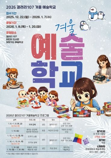 (포탈뉴스통신) 전라남도 곡성군이 운영하는 갤러리 107에서 오는 12월 22일부터 내년 1월 7일까지 ‘겨울 예술학교’ 프로그램 참가자를 모집한다고 밝혔다.