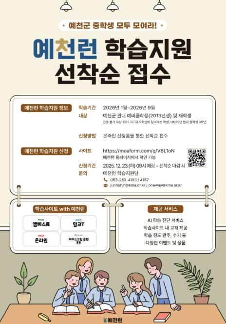 (포탈뉴스통신) 예천군은 지역 청소년의 학습격차 해소와 자기주도학습 역량 강화를 위해 추진 중인 AI 기반 학습지원 사업 ‘예천런’에 참여할 예비 중학교 1학년 및 재학생을 추가 모집한다.