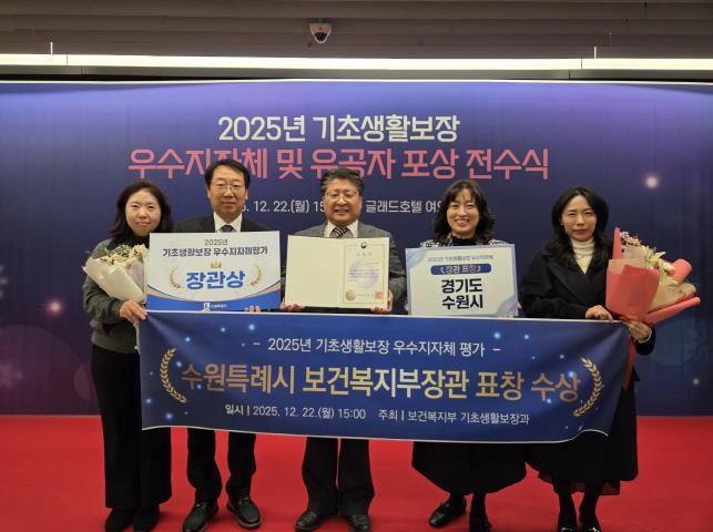 (포탈뉴스통신) 수원특례시가 보건복지부 주관 ‘2025년 기초생활보장·긴급지원 사업’ 평가에서 우수 지자체로 선정돼 보건복지부 장관 표창을 받았다. 시상식은 22일 서울 글래드호텔에서 열렸다.