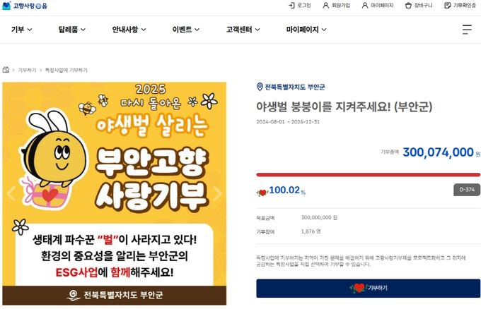 (포탈뉴스통신) 부안군은 고향사랑기부제 지정기부 ESG 사업으로 추진한 ‘야생벌 붕붕이를 지켜주세요!’ 프로젝트가 기부자들의 꾸준한 참여 속에 목표 모금액 3억원을 달성했다고 밝혔다.