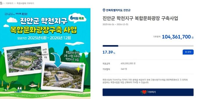 (포탈뉴스통신) 진안군이 고향사랑기부제 지정기부사업으로 지난 6월부터 추진 중인 “학천지구 복합문화광장 구축사업”이 모금 시작 6개월 만에 누적 모금액 1억 원을 달성했다.