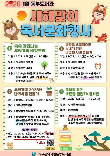 (포탈뉴스통신) 대구동부도서관은 다가오는 새해를 맞아 지역주민이 도서관에서 뜻깊은 한 해를 시작할 수 있도록 1월 한 달간 동부도서관 ‘새해맞이 특별 독서문화행사’를 운영한다.