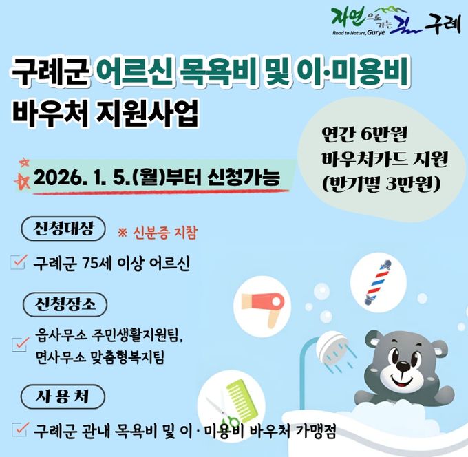 (포탈뉴스통신) 구례군은 75세 이상 어르신들의 건강하고 활기찬 노후생활 보장과 지역경제 활성화를 도모하기 위해 '어르신 목욕비 및 이·미용비 바우처 지원사업'을 본격 추진한다고 밝혔다.