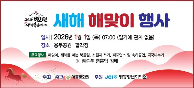 영동문화원 관계자는 “새해 첫날 군민들과 함께 희망의 마음을 모으는 뜻깊은 자리가 될 것”이라며 “앞으로도 지역 문화 활성화와 공동체 화합을 위한 다양한 행사를 지속적으로 추진하겠다”고 밝혔다.