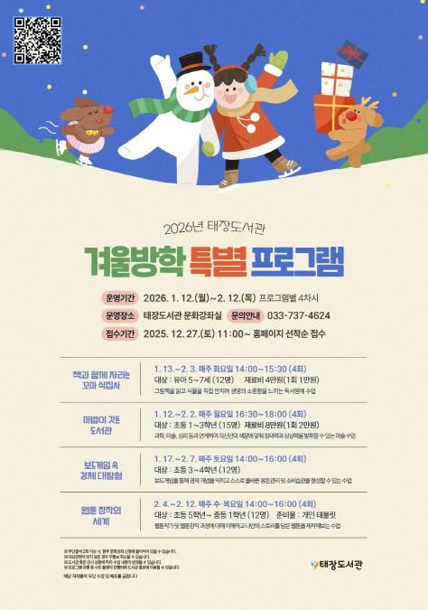 (포탈뉴스통신) 원주시 태장도서관은 겨울방학을 맞아 1월 12일부터 2월 12일까지 겨울방학 특별 프로그램을 운영한다.