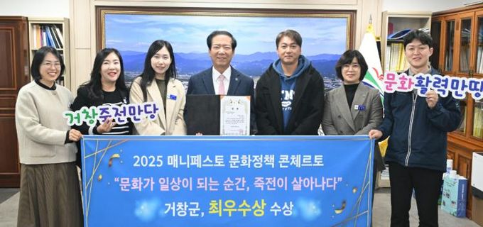 (포탈뉴스통신) 거창군은 강원특별자치도 원주시 상지대학교에서 개최한 ‘2025 전국 기초단체장 매니페스토 문화정책 콘체르토(Concerto)’ 대회에서 문화기반 도시활력분야 ‘최우수상’을 수상했다고 26일 밝혔다.
