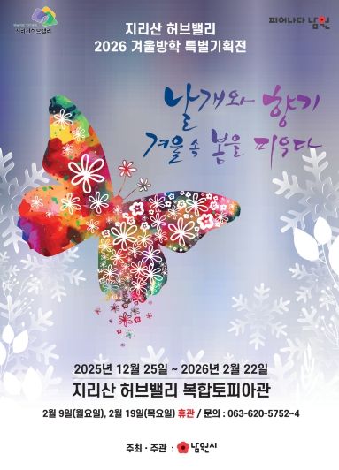 (포탈뉴스통신) 남원시가 겨울방학을 맞아 오는 12월 25일부터 내년 2월 22일까지 지리산허브밸리 내 복합토피아관에서 겨울방학 특별기획전 ‘날개와 향기, 겨울 속 봄을 피우다’를 개최한다.