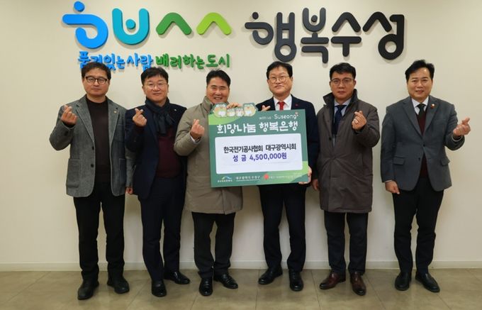 (포탈뉴스통신) 한국전기공사협회 대구광역시회는 지난 26일 관내 어려운 이웃을 위해 성금 450만 원을 수성구청에 전달했다.