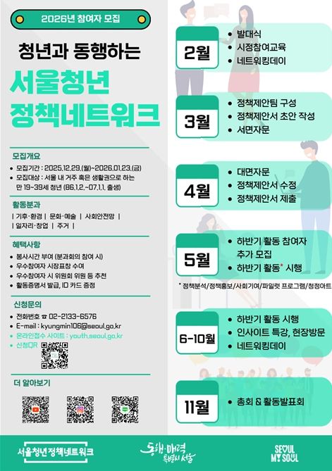 (포탈뉴스통신) 서울시는 청년이 서울시정에 참여해 정책을 제안하는 서울청년정책네트워크 신규 위원 350명을 모집한다. 신청기간은 2025년 12월 29일부터 2026년 1월 23일까지이고, 청년몽땅정보통에서 접수를 받는다.