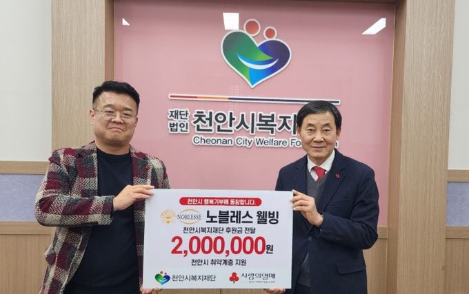 (포탈뉴스통신) (재)천안시복지재단은 지난 30일 노블레스 웰빙이 취약계층을 위한 후원금 200만 원을 기탁했다고 밝혔다.