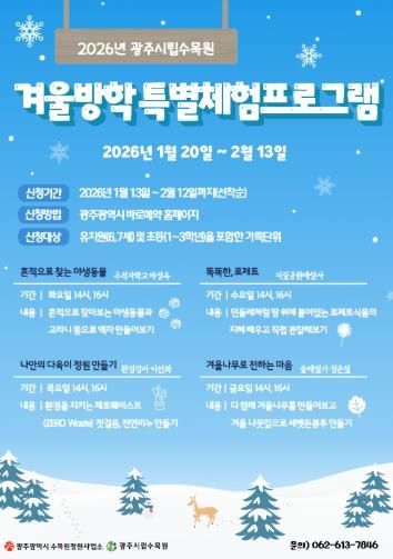 (포탈뉴스통신) 광주광역시 시립수목원은 어린이를 위한 ‘2026년 겨울방학 체험 프로그램’ 참가자 640명을 오는 13일 오전 10시부터 선착순 모집한다.