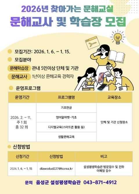 (포탈뉴스통신) 음성군은 성인 비문해 학습자를 대상으로 한 ‘2026년 찾아가는 문해교실’ 운영을 위해 문해교사와 학습장을 모집한다고 밝혔다.