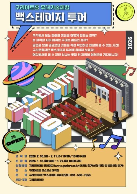 (포탈뉴스통신) 구리문화재단은 〈무대 기술 체험 백스테이지 투어 프로그램〉 참가자를 오는 1월 13일 오전 9시부터 1월 27일 오후 6시까지 재단 홈페이지를 통해 선착순 모집한다고 밝혔다.