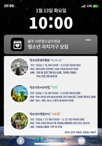 (포탈뉴스통신) 울주군시설관리공단 서부청소년수련관은 청소년의 참여 활성화와 자치 역량 강화를 위해 2026년도 청소년 자치기구 신규 참여 청소년을 모집한다고 밝혔다.