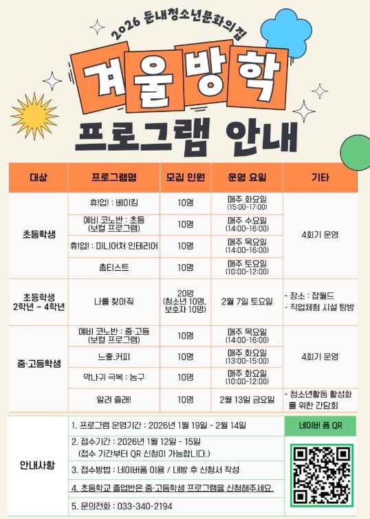 (포탈뉴스통신) 둔내청소년문화의집이 다가오는 겨울방학을 맞아 지역 청소년들의 소질 계발과 유익한 여가 선용을 위한 ‘2026년 겨울방학 프로그램’ 수강생을 모집한다.