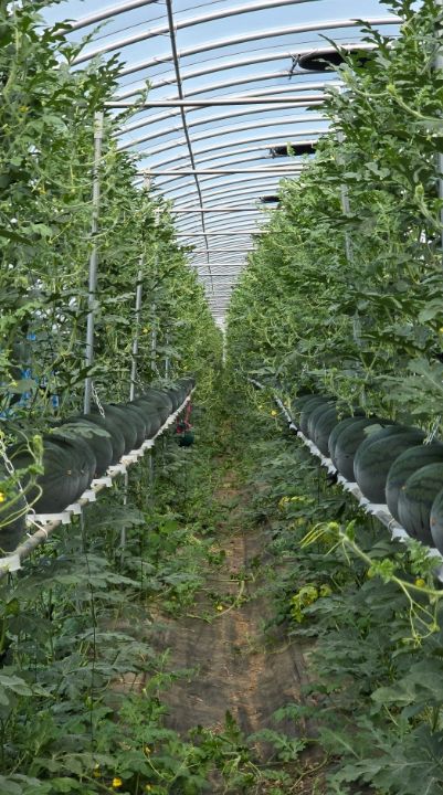 수박 수직재배는 기존 포복 2줄 재배에서 3줄로 밀식재배가 가능해 생산량을 약1.5배 늘릴 수 있으며, 허리를 굽히지 않고 선 자세로 관리가 가능해 노동강도를 낮추고 작업 효율을 크게 향상시키는 장점이 있다.