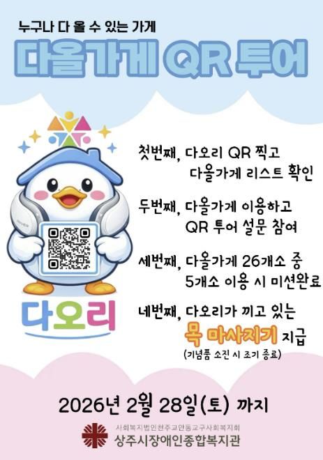 (포탈뉴스통신) 상주시장애인종합복지관은 1월 2일부터 2월 28일까지 지역 내 무장애 상가 이용을 활성화하기 위한‘다올가게 QR 투어’ 캠페인을 진행한다.