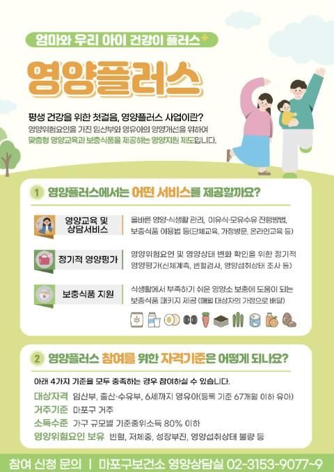 신청 대상은 마포구에 거주하는 임산부와 등록 기준 67개월 이하 영유아로, 가구 규모별 기준 중위소득 80% 이하이면서 빈혈, 성장부진, 영양섭취상태 불량 등 영양 위험요인이 확인된 경우 선정 절차를 거쳐 참여할 수 있다.