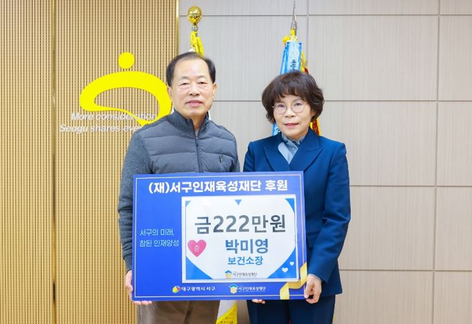 (포탈뉴스통신) 대구 서구청은 보건소 박미영 보건소장이 퇴임을 앞두고 지역 인재 육성을 위해 서구 인재육성재단에 222만 원을 기탁했다고 밝혔다.