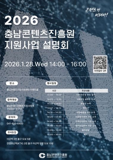 (포탈뉴스통신) (재)충남콘텐츠진흥원(원장 김곡미)은 오는 1월 28일 오후 2시, 충남콘텐츠기업지원센터 이벤트홀에서 ‘2026년 지원사업 설명회’를 개최한다고 밝혔다.