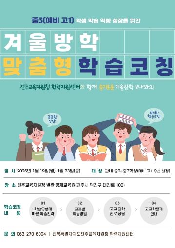 (포탈뉴스통신) 전북특별자치도전주교육지원청은 학교급 전환기를 맞은 중학교 3학년 학생들의 학습 공백을 최소화하고, 성공적인 고등학교 안착을 돕기 위해 ‘겨울방학 맞춤형 학습코칭’을 운영한다고 15일 밝혔다.