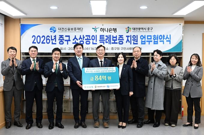 (포탈뉴스통신) 대전 중구는 지난 2024년과 2025년에 이어 올해에도 중구 관내 소상공인 경영안정자금 지원을 위해 대전신용보증재단, 하나은행과 협약을 맺고 총 84억 원 규모의 소상공인 특례 보증을 지원한다고 15일 밝혔다.