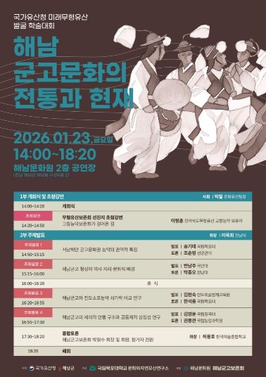 토론에서는 해남 군고문화의 가치와 의미를 공유하고, 미래 무형유산으로서의 보존과 계승 방안에 대하 자유롭게 의견을 나눌 예정이다. 군 관계자는“이번 학술대회가 해남 군고문화의 정체성을 재조명하고, 미래 무형유산으로서 체계적인 보존과 활용 방안을 모색하는 계기가 되길 바란다”고 전했다.
