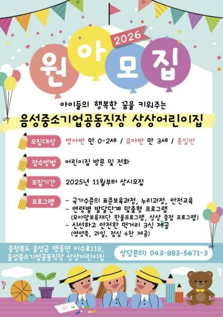 (포탈뉴스통신) 음성군은 중소기업 근로자의 보육환경 개선과 일·가정 양립 문화 확산을 위해 운영 중인 중소기업 공동직장어린이집 ‘상상어린이집’의 원아를 모집한다.
