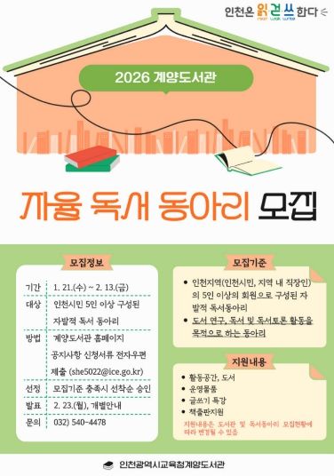 (포탈뉴스통신) 인천광역시교육청계양도서관은 지역 내 독서 문화를 확산하고 시민의 자발적인 독서 활동을 지원하기 위해 ‘2026년 자율 독서동아리’를 모집한다.