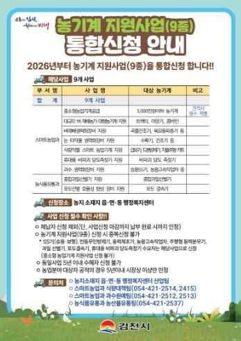 (포탈뉴스통신) 김천시는 지역 농업인을 대상으로 ‘2026년 농기계 지원사업(9종)’ 신청을 오는 2026년 1월 30일(금)까지 농지소재지 읍면동 행정복지센터에서 접수한다고 밝혔다.