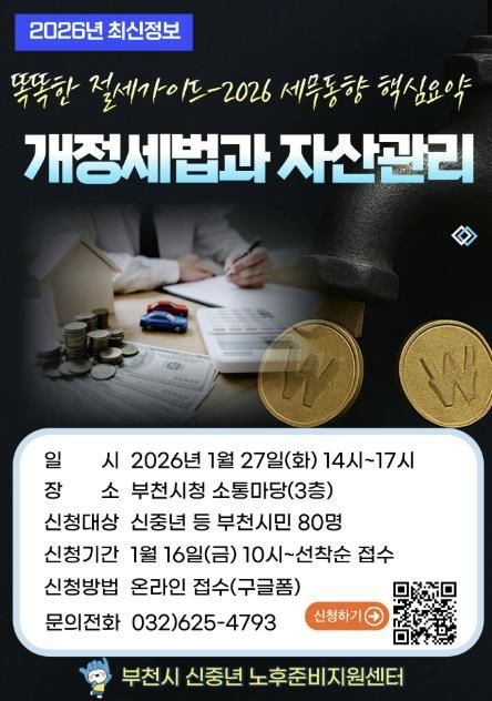 (포탈뉴스통신) 부천시는 1월 27일 시청 3층 소통마당에서 ‘2026년 개정세법과 자산관리’ 재무특강을 진행한다. 이번 특강은 오후 2시부터 5시까지 부천시민 80명을 대상으로 무료로 진행되며, 신중년의 자산관리 역량을 높이고 안정적인 노후설계를 지원하기 위해 마련됐다.
