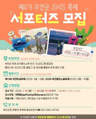(포탈뉴스통신) 부안군은 오는 19일부터 30일까지 부안의 대표 축제를 홍보할 제6기 부안군 SNS 축제 서포터즈’를 모집한다.