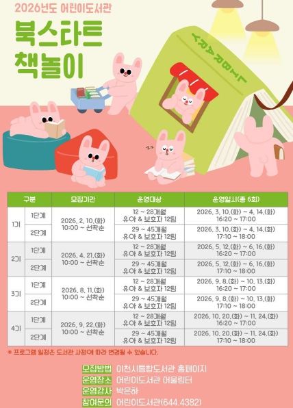 이번 프로그램은 3월부터 11월까지 총 4기, 2단계 반으로 구성된다. 참여 대상은 ▲1단계: 12 ~ 28개월 유아와 보호자, ▲2단계: 29 ~ 45개월 유아와 보호자이다. 1기 참여 신청은 2월 10일 오전 10시부터 이천시통합도서관 누리집을 통해 선착순으로 가능하다.